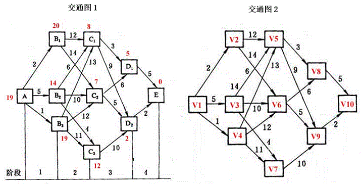 下图表示城市之间的交通路网,线段上的数字表示费用,单向通行由A->E。试用动态规划的最优化原理求出A->E的最省费用。