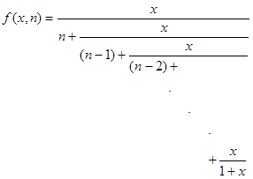 #include<iostream> #include<cmath> using namespace std; double x; int n; double f(double x,int n){//返回型递归,函数须return if(n==1)return x/(1+x); return x/( n + f(x,n-1) ); } int main() { cin>>x>>n; printf("%.2f",f(x,n)); return 0; }//OK
