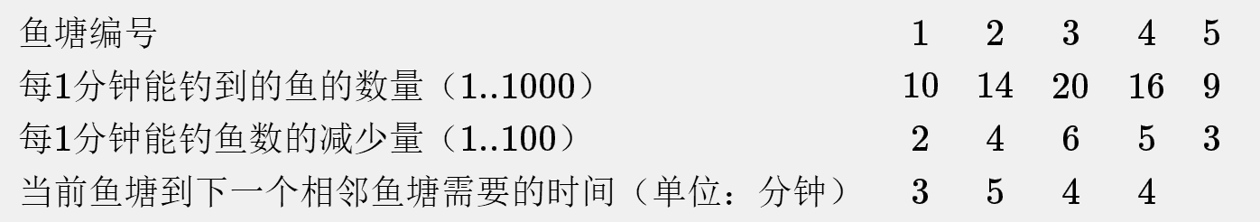 即:在第1个鱼塘中钓鱼第1分钟内可钓到10条鱼,第2分钟内只能钓到8条鱼,……,第5分钟以后再也钓不到鱼了。从第1个鱼塘到第2个鱼塘需要3分钟,从第2个鱼塘到第3个鱼塘需要5分钟,……